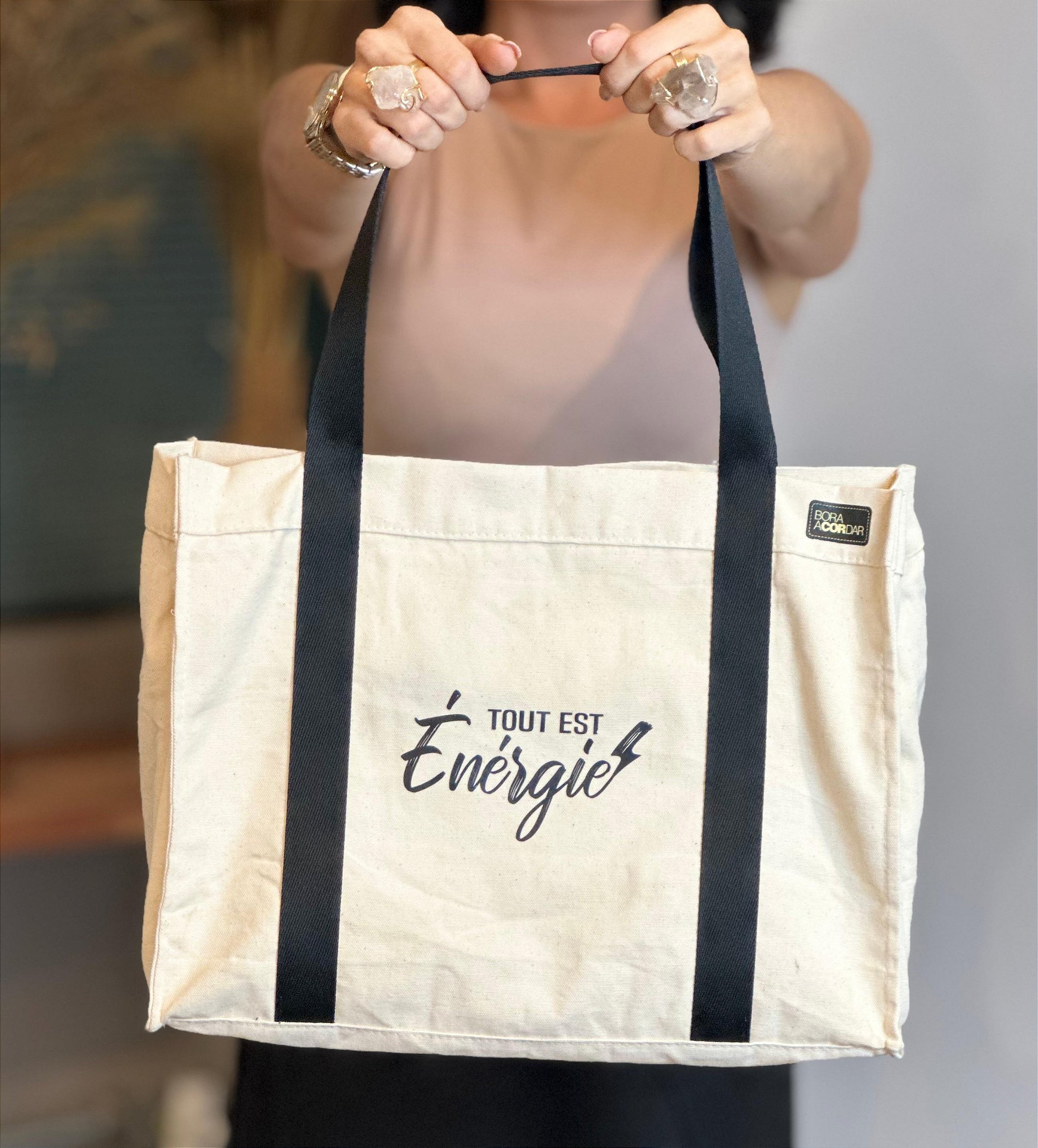Essa ecobag nasceu da ideia de carregarmos frases e palavras de poder no nosso dia a dia, por isso, ela faz parte da nossa coleção “Tudo é energia” do Bora Acordar.