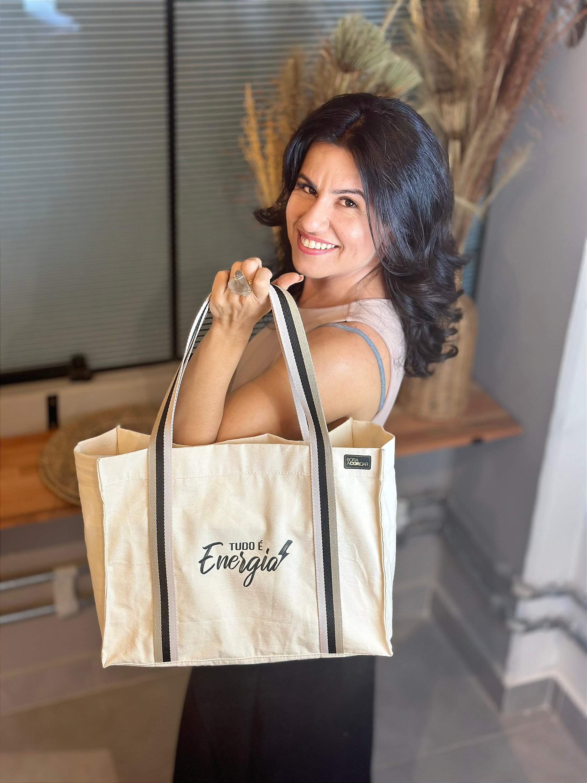 Essa ecobag nasceu da ideia de carregarmos frases e palavras de poder no nosso dia a dia, por isso, ela faz parte da nossa coleção “Tudo é energia” do Bora Acordar.